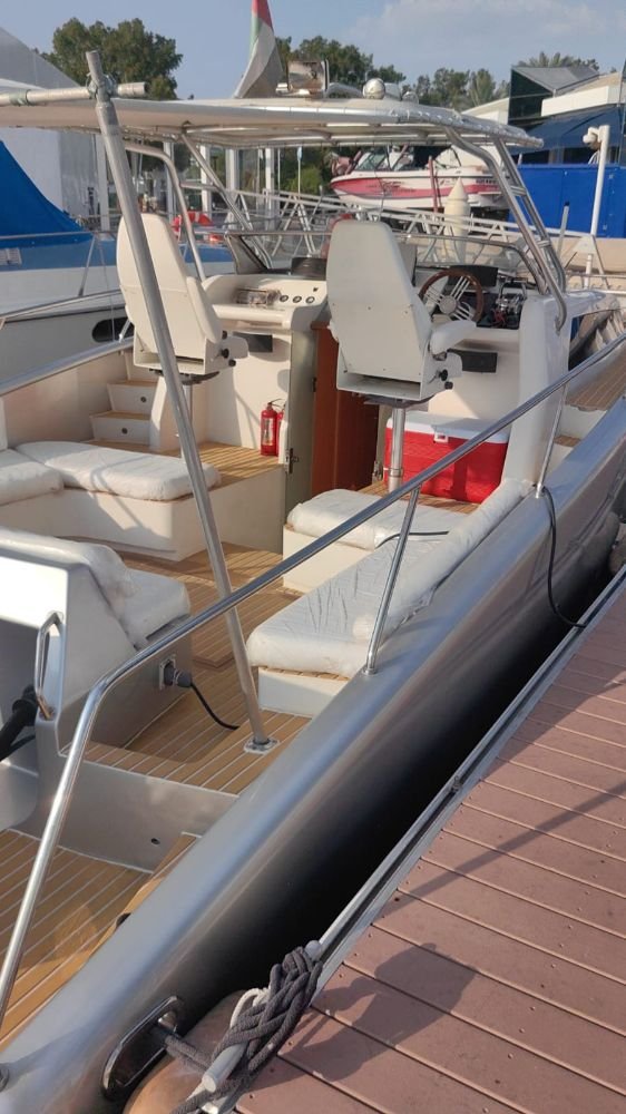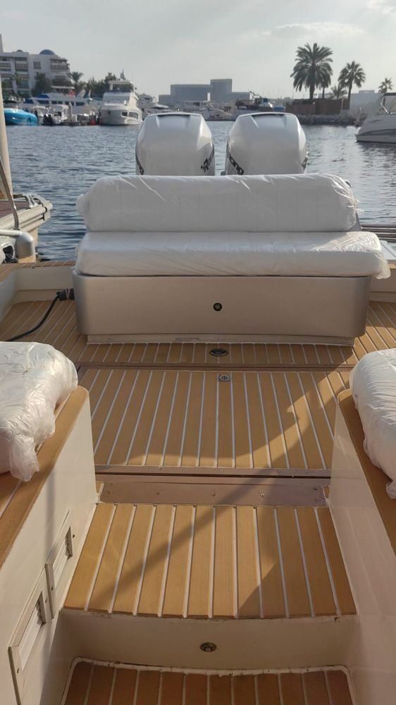 This 36ft sport cruiser, built by Oceandro Shipyard-Egypt, offers an excellent balance of performance, comfort, and style. Powered by twin Mercury 400HP R supercharge engines, the boat delivers strong acceleration, smooth handling, and an enjoyable cruising experience, making it ideal for Dubai waters.