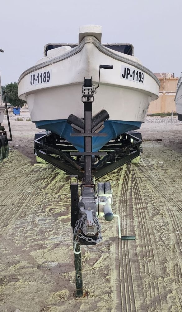 طول القارب 28 قدمًا، عرض القارب 7.5 قدمًا، لون الجزء العلوي من القارب أبيض، والجزء السفلي أزرق